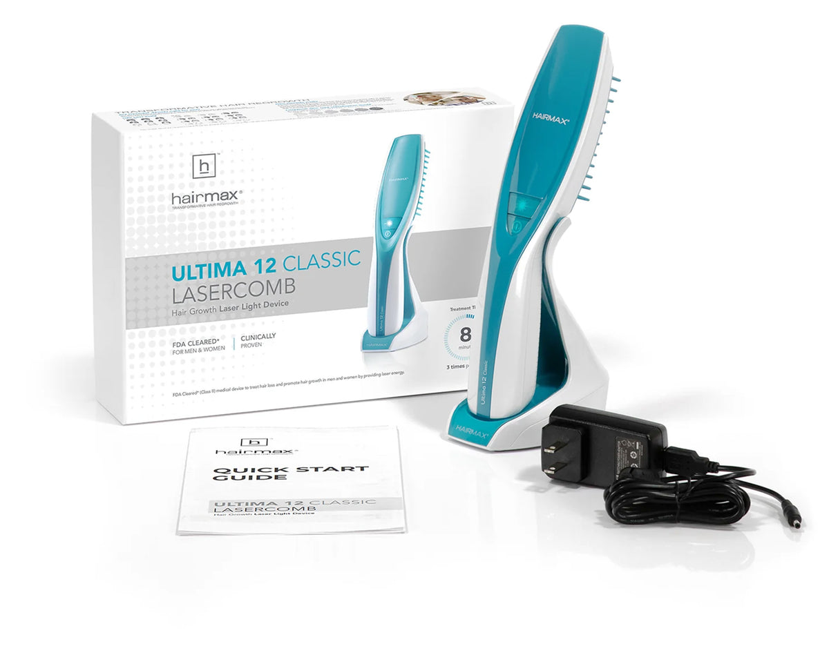 HairMax Ultima 12 Classic LaserComb คือหวีเลเซอร์เกรดการแพทย์จากอเมริกา 655 นาโนเมตร 12 ไดโอด ที่ออกแบบมาเพื่อฟื้นฟูผมบางและลดการหลุดร่วงอย่างตรงจุด ด้วยดีไซน์เรียบหรู มีหน้าจอแจ้งเวลา และสั่นเมื่อต้องเลื่อนจุด จับถนัดมือ พกพาง่าย เหมาะกับผู้ที่ต้องการผลลัพธ์จริงโดยไม่ต้องพึ่งยา